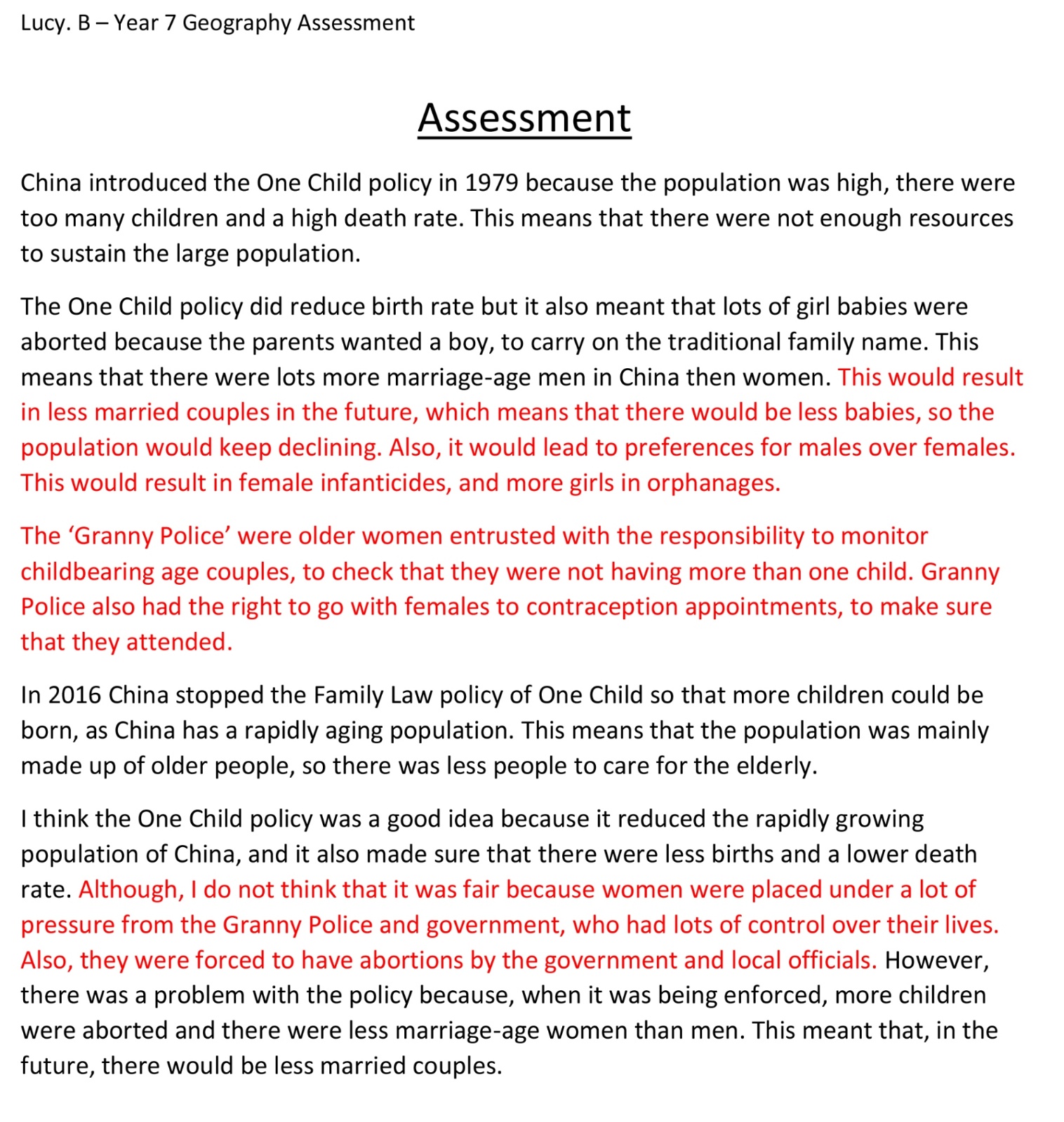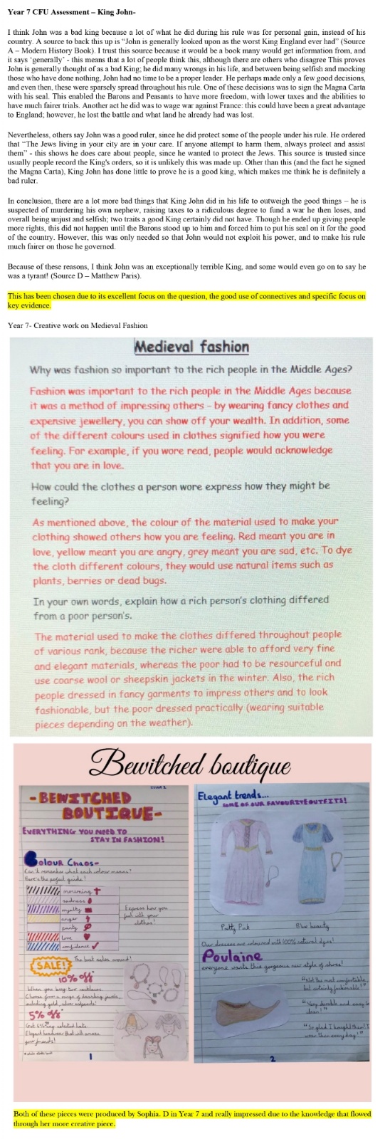 Technology project by Cameron. B, History work by Sophia. D and Geography assessment by Lucy. B