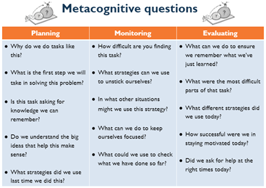 - Metacognition: Thinking about how you learn best and recognising successful strategies. Students who reflect on their learning process and can see that a particular method or technique helped them remember something really well is the meta cognitive process. We encourage students to understand this process through the metacognition work we do in our tutor time programme with all year groups.