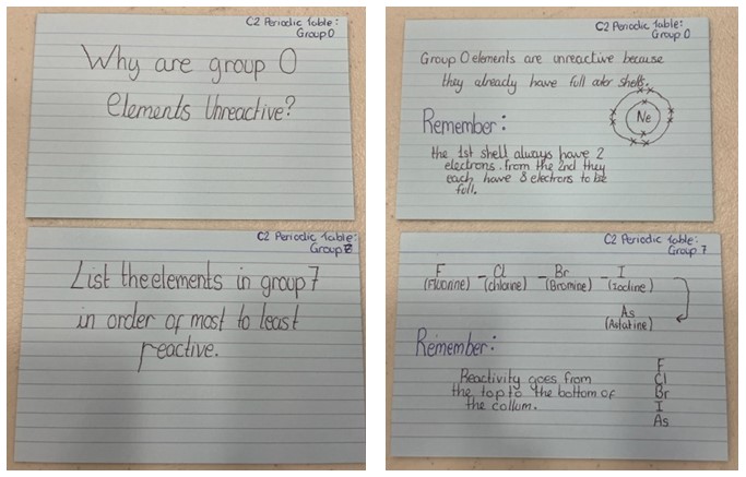 The reverse of the card has more detail – the answer to the question as well as knowledge around the answer. Students are reminded about right/wrong piles and guided on how they can use the cards with friends and family to support retrieval. Dual coding and use of colour reinforced. |