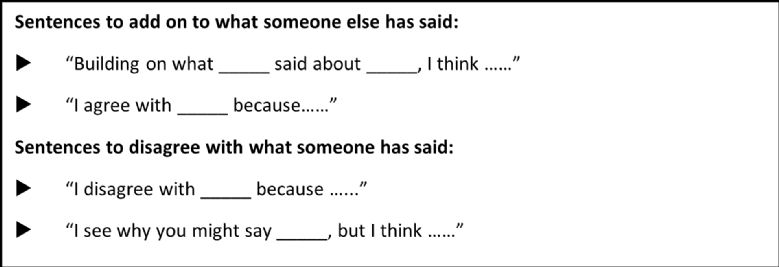 Oral rehearsal builds confidence and helps remove the fear of committing the wrong thing to paper which can be an obstacle to writing. Think-Pair-Share can be an excellent tool as it encourages students to listen to teacher input and then discuss their answers with a partner before group/class feedback to check for misunderstanding or writing down their rehearsed answer. Once students are confident and adept at doing this, we can then introduce this in a wider classroom setting. Sentence stems can be a helpful way to scaffold this structured discussion: