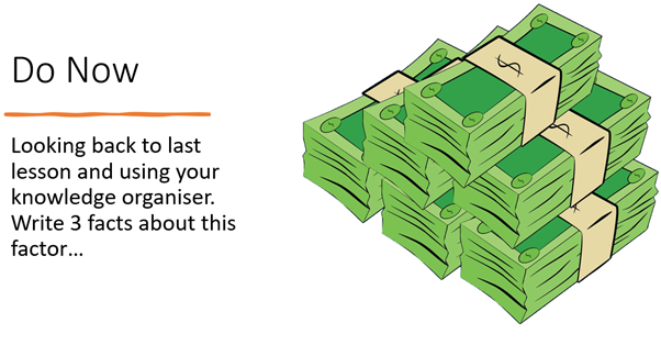 They advised designing knowledge organisers following the principles of dual coding. These were not to then be filed away or sent home with students to never again see the light of day! Each knowledge organiser was handed out at the start of the topic and stuck into the student book. The images used in the knowledge organiser were then used in every ‘Do Now’ activity, so that students became used to using them as an information source.