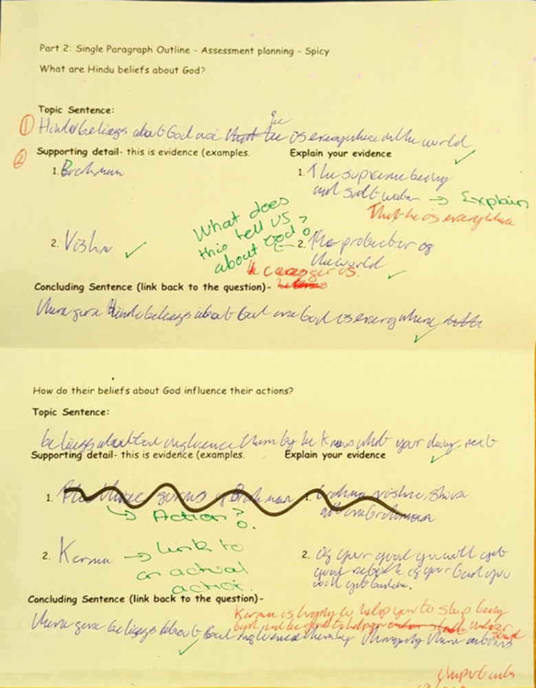 This is an example of how the teacher is giving live feedback when a student is preparing for an assessment. The key thing here is that the teacher is quickly checking where there are weaknesses in the plan, which allows the student to be more successful in the assessment. As you can see, it didn’t take long for the teacher to glance through and identify where improvements could be made quickly.