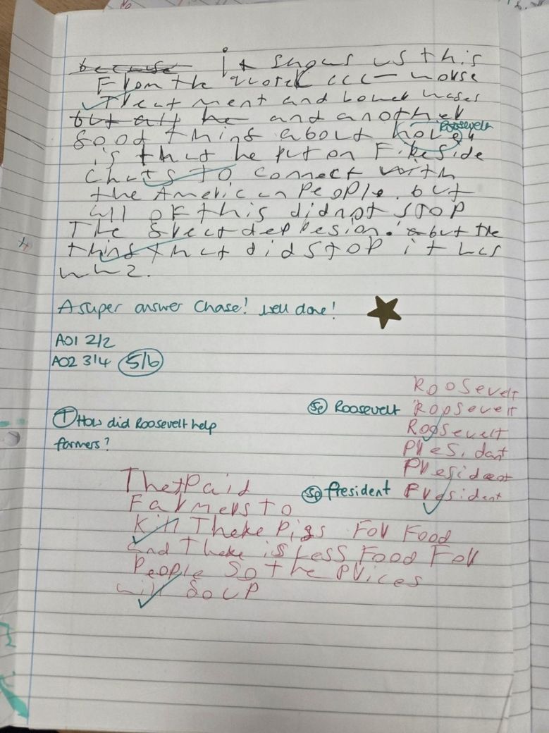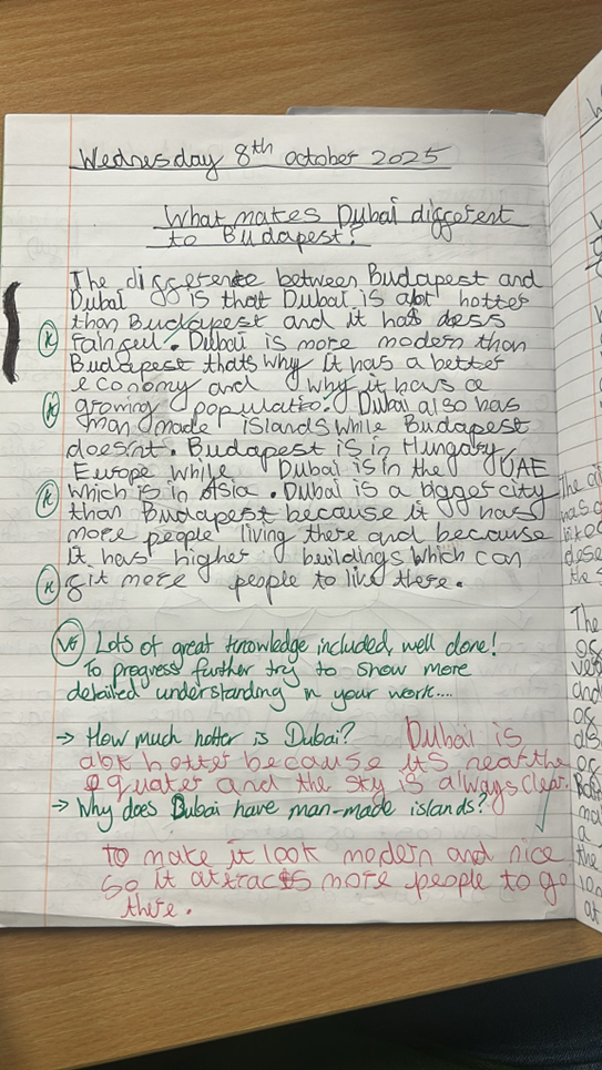 This teacher has marked a piece of work and given the student a question to answer, to get more information out of them. They answered the first question, but the teacher wasn’t quite happy, so they went back and asked another question to draw more information out of them.