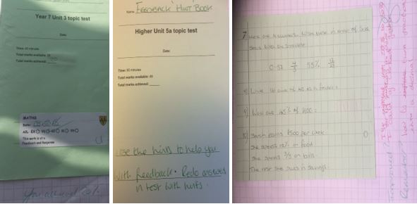 To finish, I just want to highlight some excellent practice I have seen recently in maths and how this is having an impact, not only on student progress but also on teacher workload- two key issues for all of our teachers. Jo Poulter has a very clear and easy way of giving her students feedback, she has found this has reduced the time she is spending marking, the students find it useful for them and they have improved their knowledge and skills because of it, so a winner all around. The theory is very simple, the students do a task or an assessment, which Jo marks, and gives a score to. She then completes a feedback sheet, which gives the students guidance on how to answer the questions they got wrong, and the students go back and attempt the questions again on the original paper, in red. She then gives them some similar questions to show that the students have learnt, which can be peer marked or by Jo when she is walking around during response time. If you don’t believe me in that this saves time, please go and speak to her and look at her books, which are excellent. Below are some pictures to give you an example.