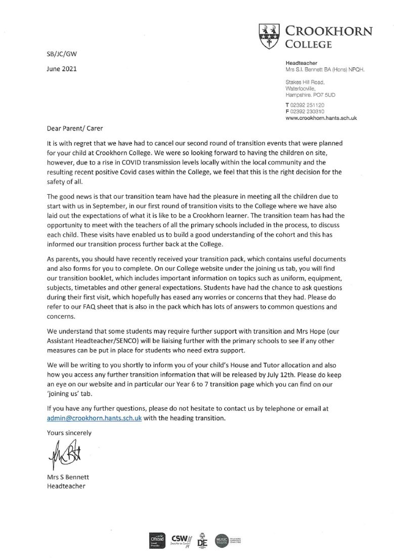 We regret to inform parents/carers that the second round of our Primary School Transition event (that we had planned over the next few weeks) has unfortunately been canceled. please see the letter from our Headteacher, Mrs Bennett below:
