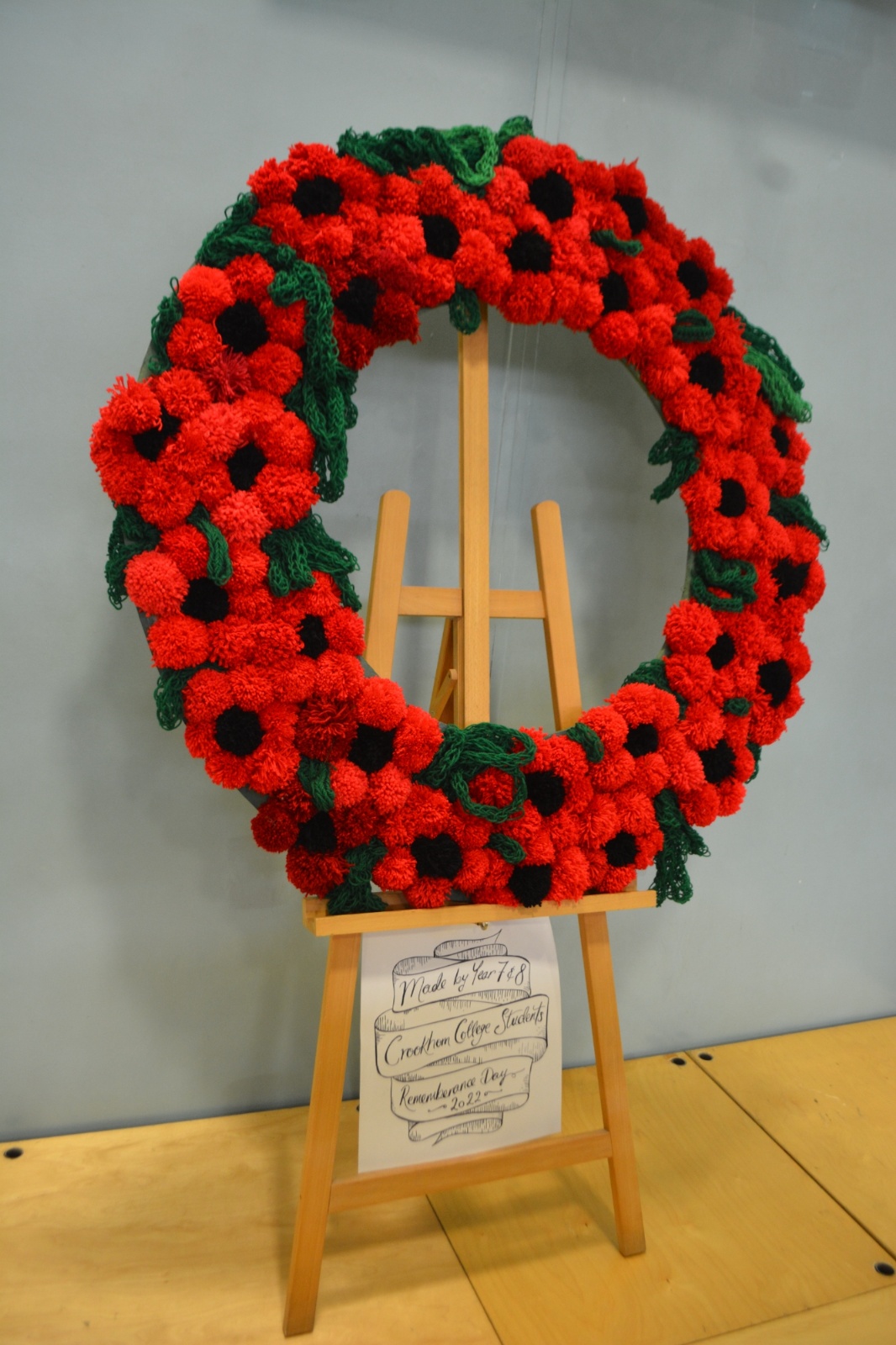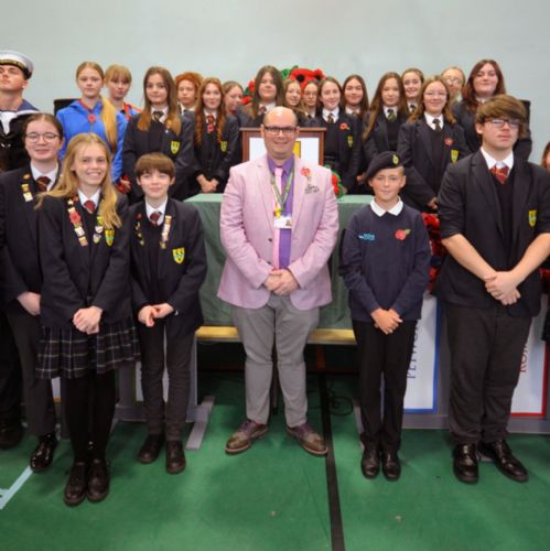 Our service continued with a reading of the poem 'Falklands Task Force' by Robert C Millar, from our Headteacher, Mrs Bennett, who stood in front of a beautiful, hand-made poppy wreath; created by our Year 7 & 8 art and textiles students using pom poms.