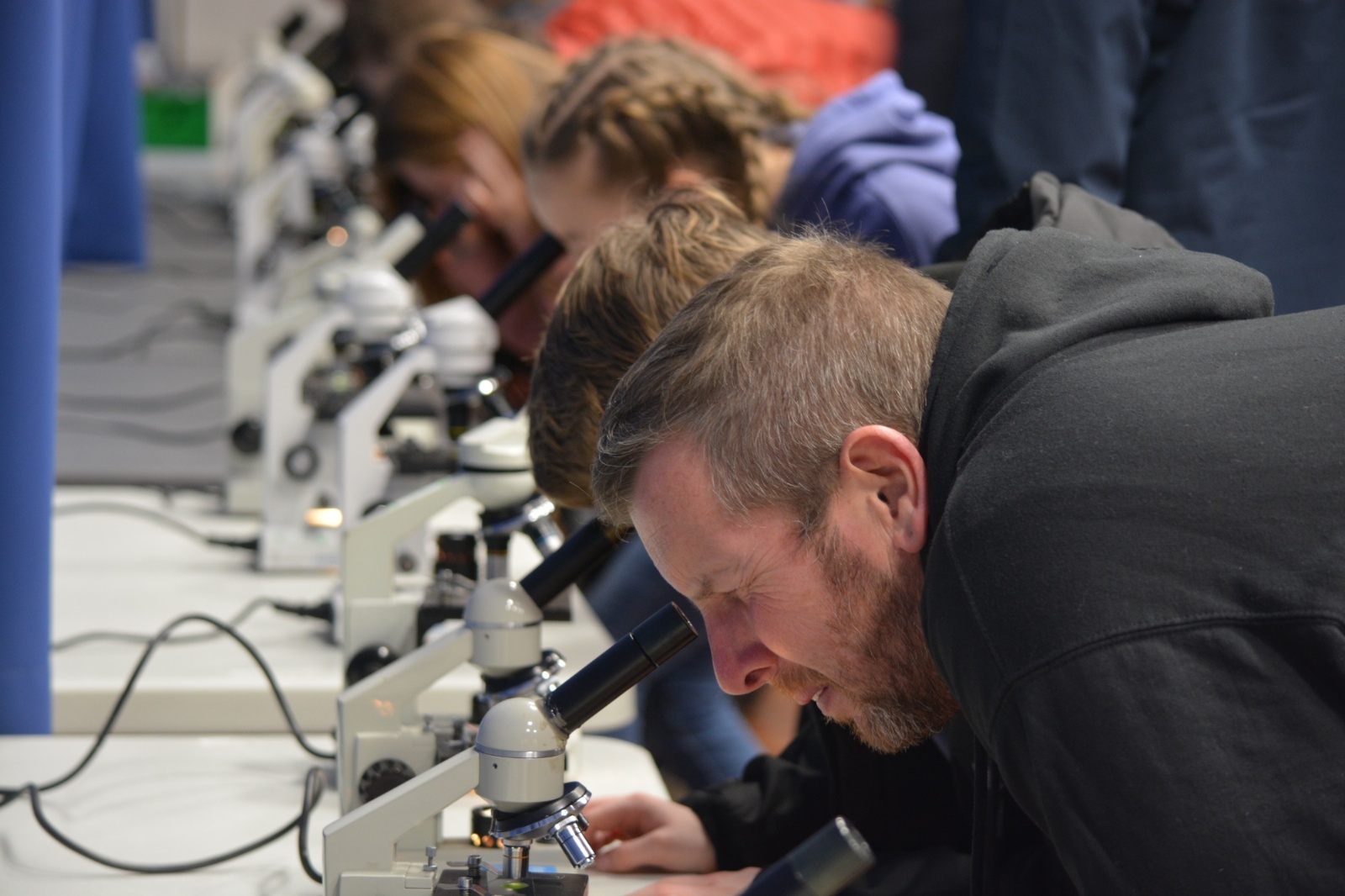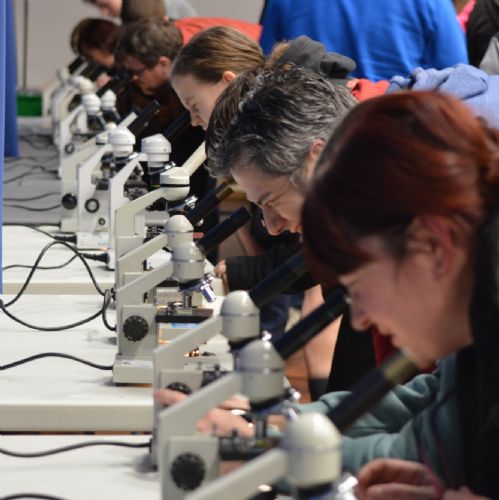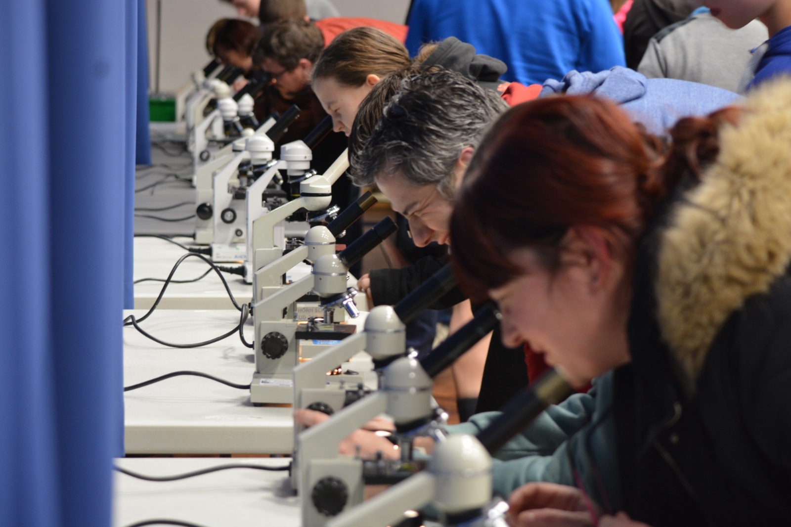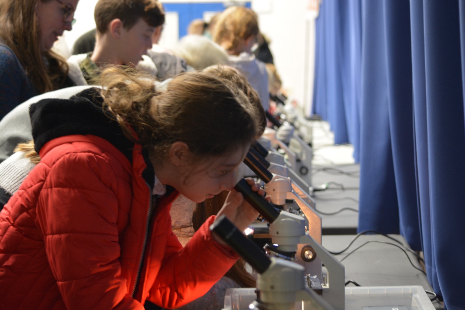 After a short break, our guests returned to a pitch-black Main Hall to venture into the Bathypelagic Zone; a layer of the ocean that is surrounded in darkness, and teaming with life. Here our student volunteers explained Bioluminescence (the production and emission of light by a living organism) with glow sticks, while being lured to the front of the stage by a strange light and familiar voice.