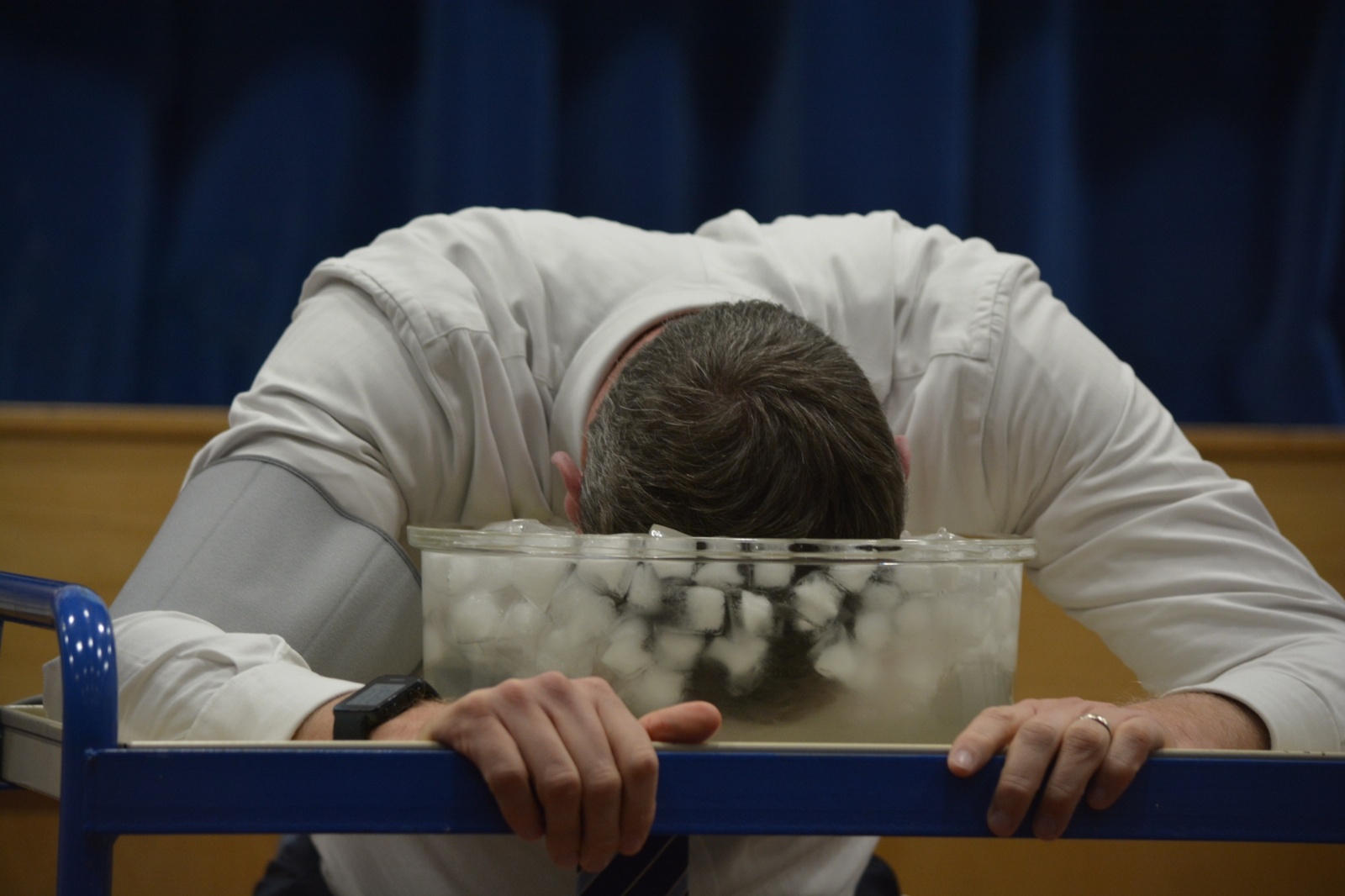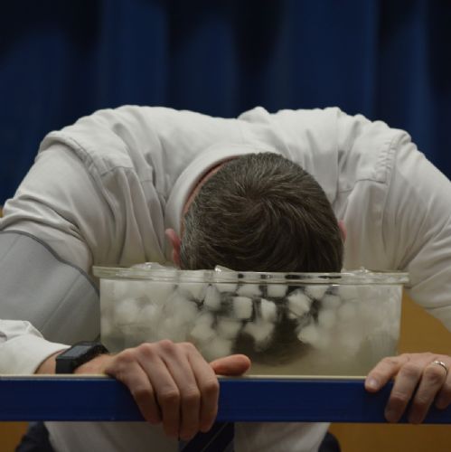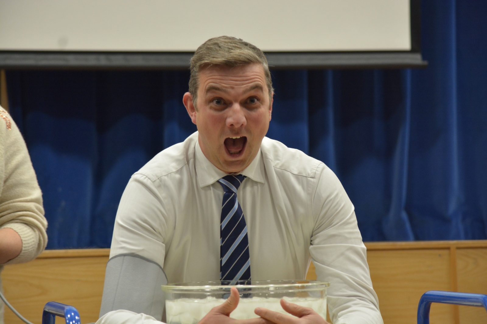 Next, we took a dive into the Mesopelagic Zone (also known as the Twilight Zone) and explained how sea creatures have developed adaptations to deal with the extreme underwater pressure they face. One of these remarkable adaptations is the Dive Reflex, which we were able to explain with a live demo, and assistance from Mr Colins, our Deputy Headteacher. To demonstrate this, we dunked his face into ice water whist measuring his heart rate. While we didn't manage to achieve the data for the results, it was fun to see Mr Colins take the plunge, in the name of science.