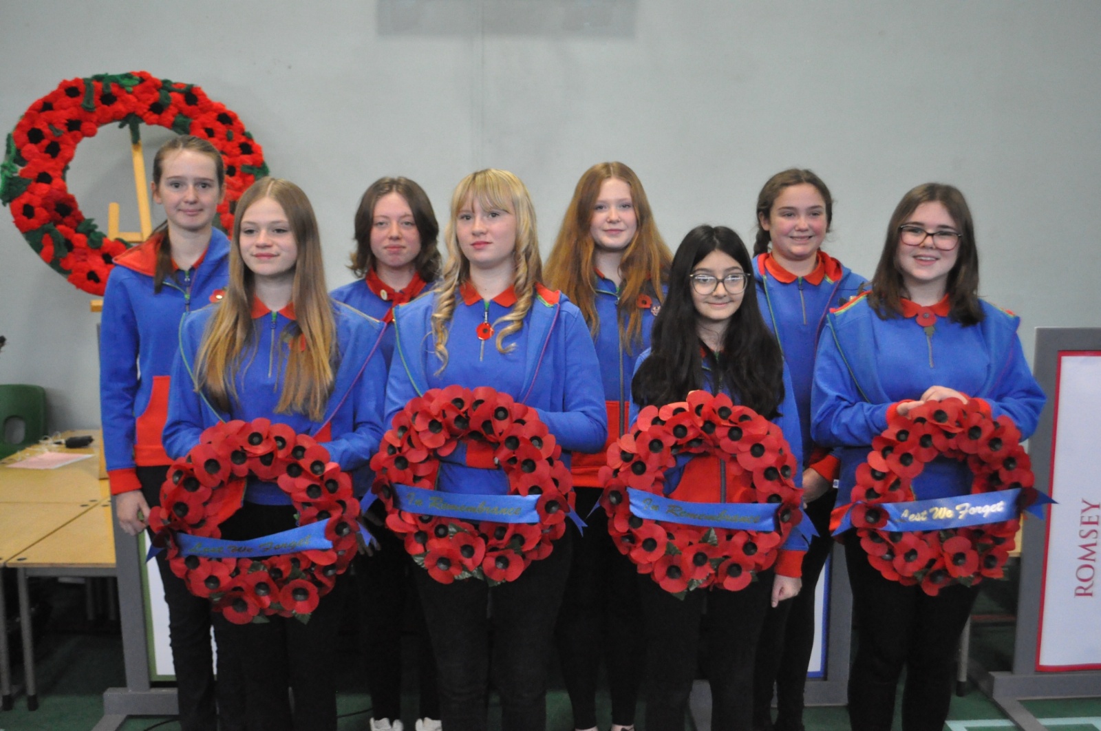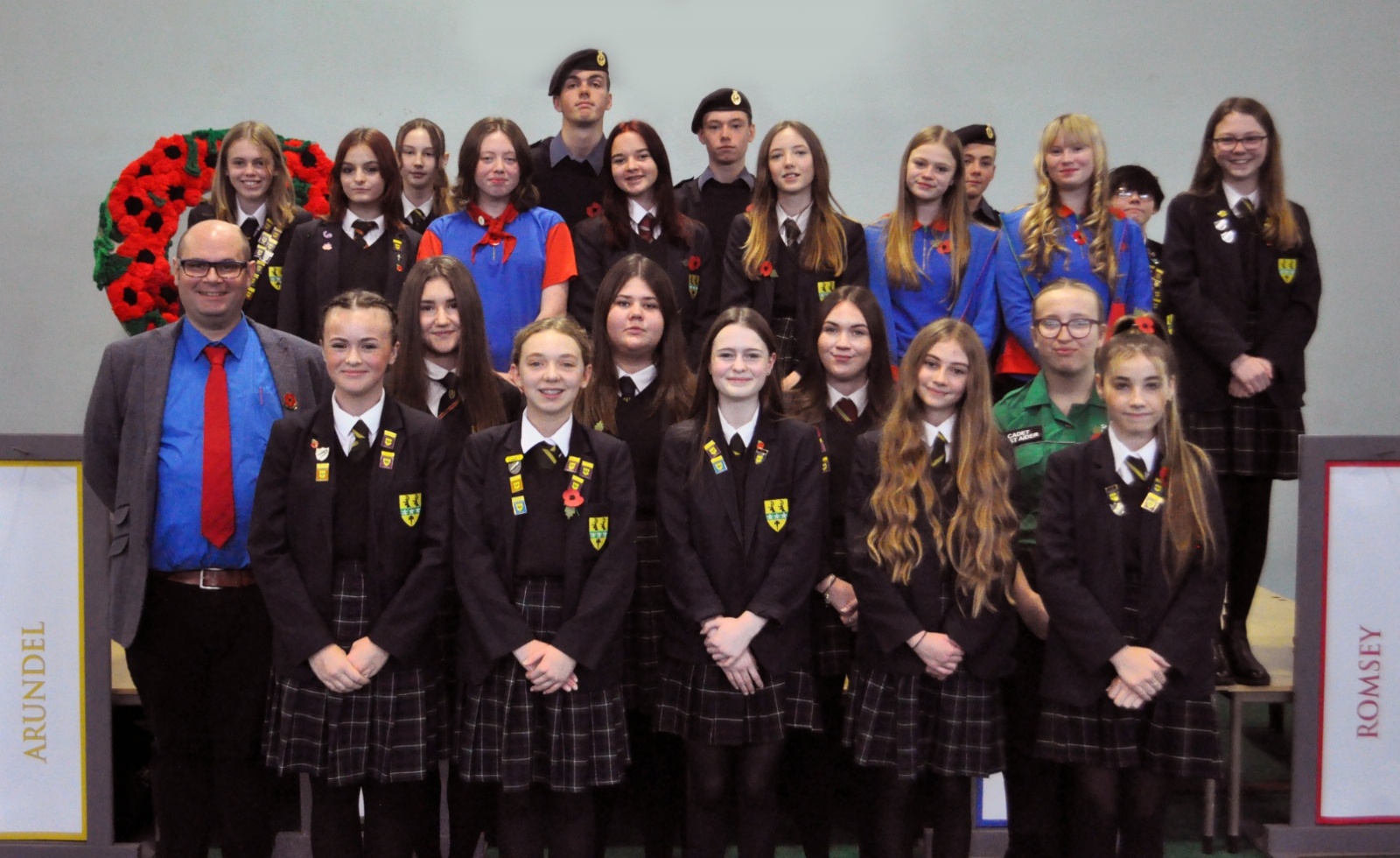 After that, we listened to readings of the poems 'The One' and 'In Flanders Fields' by our Head Boy and Head Girl, who stood in front of a beautiful, hand-made poppy wreath, created by our art and textiles students using pompoms.