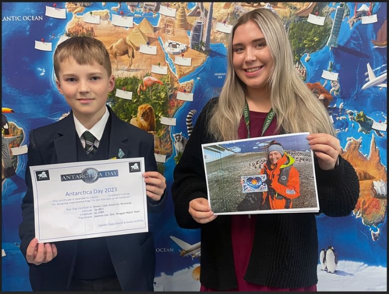 As part of a geography competition organised by Miss Hill, students were tasks to design a flag for Antarctica, to be used as part of the UK Polar Network scheme. From all the entries, Year 8 student Layton .P was selected as the winner for his impressive digital art and has received an email back from the scientists in Antarctica with an image of his flag there with the penguins.