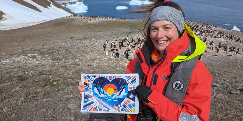 The photograph was taken at Kinnes Cove in the Antarctic Peninsular (Latitude -56.4831, Longitude -62.2989) featuring Research Associate Jasmine Lee, who is part of the Penguin Watch Team.
