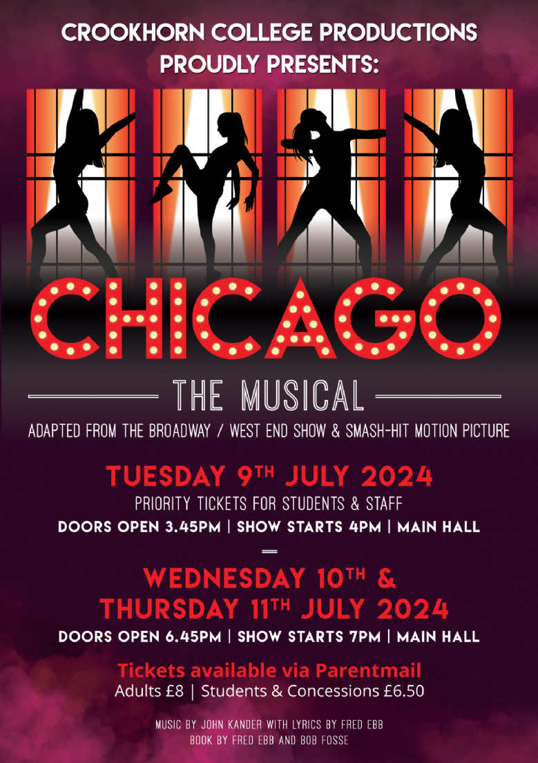 Lights, camera, action! Get ready to be transported back to the jazz-filled streets of Chicago in our latest Crookhorn College production. After the phenomenal success of "Little Shop of Horrors" last year, we're thrilled to present our rendition of the iconic musical, Chicago!