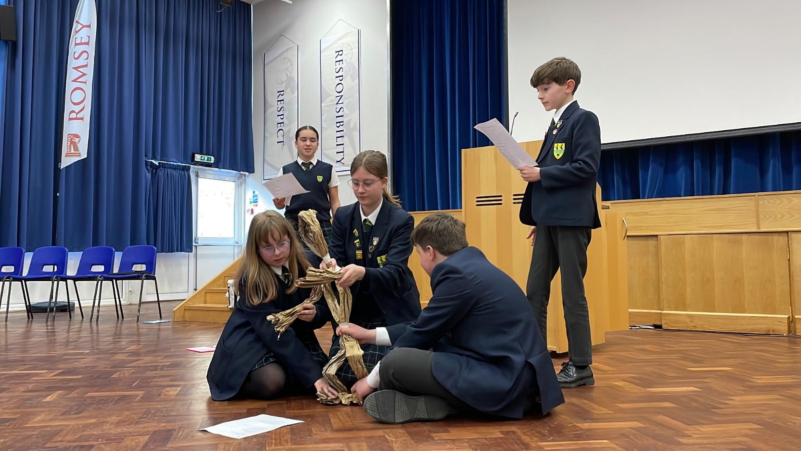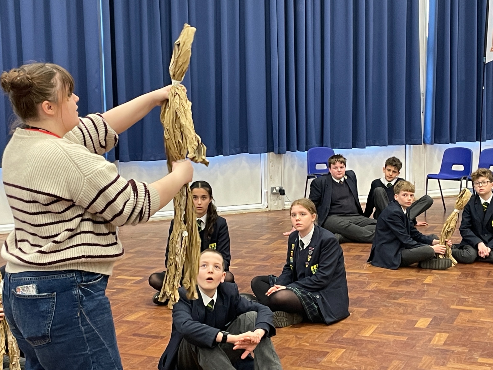 Once their puppets were complete, the students brought them to the stage to perform a scene from 'The BFG'. In each group, three students worked together to puppeteer a character representing Sophie, while one student played the role of the BFG and another provided the puppet’s voice.