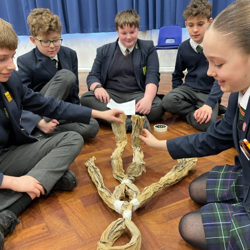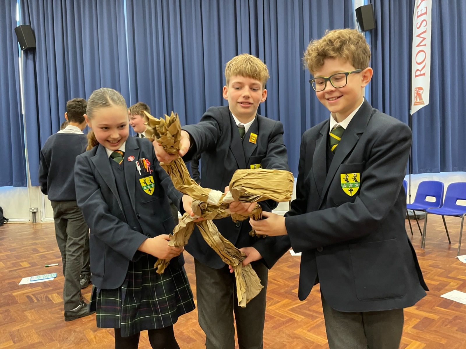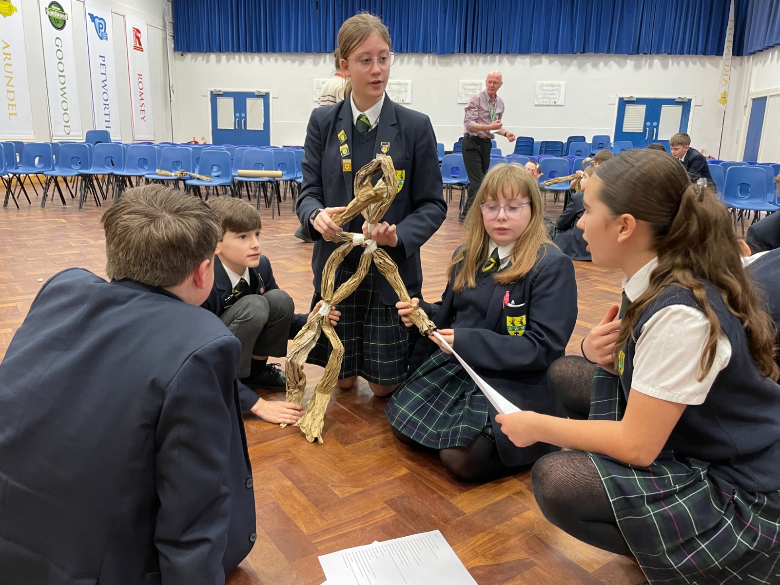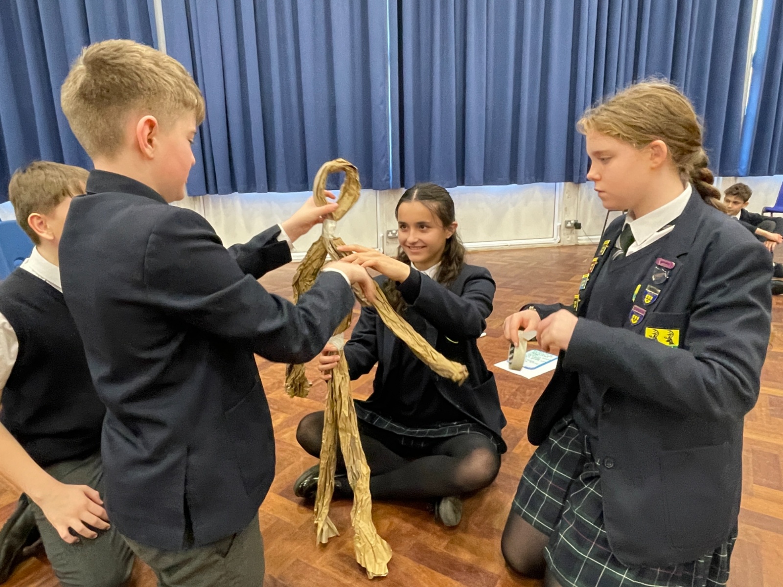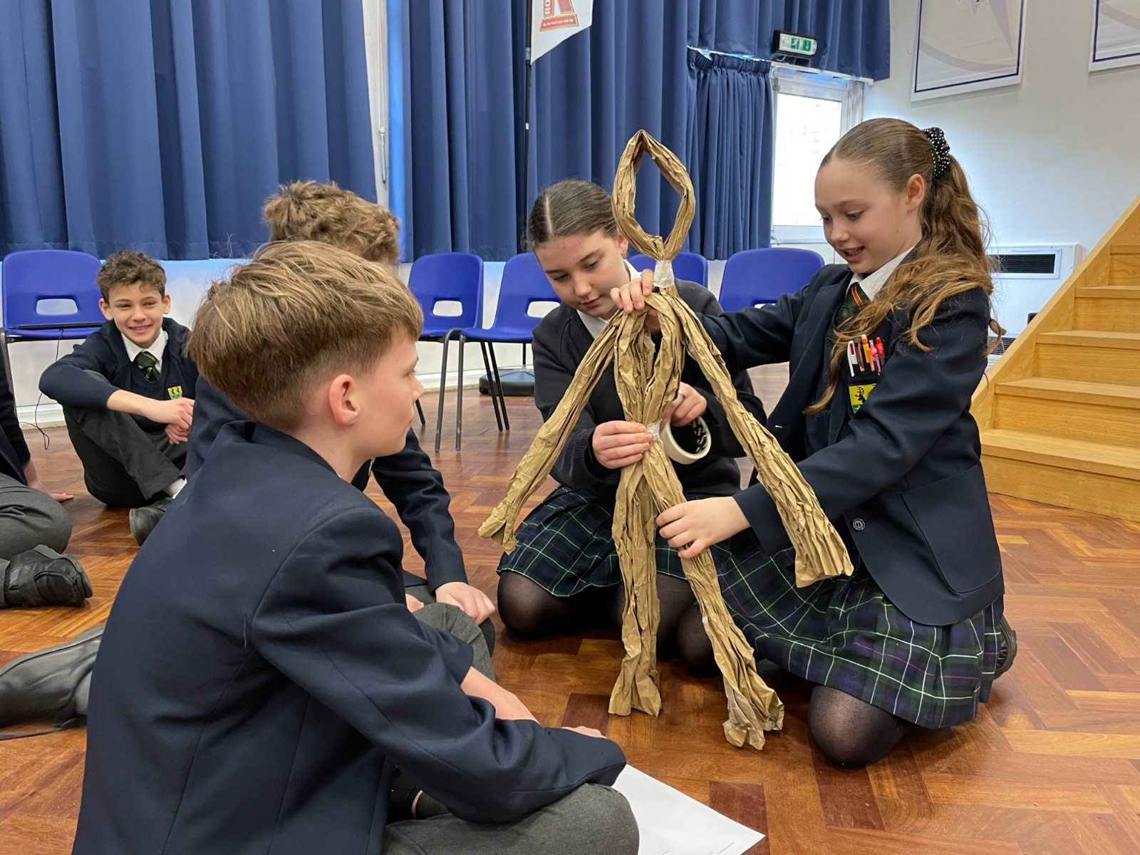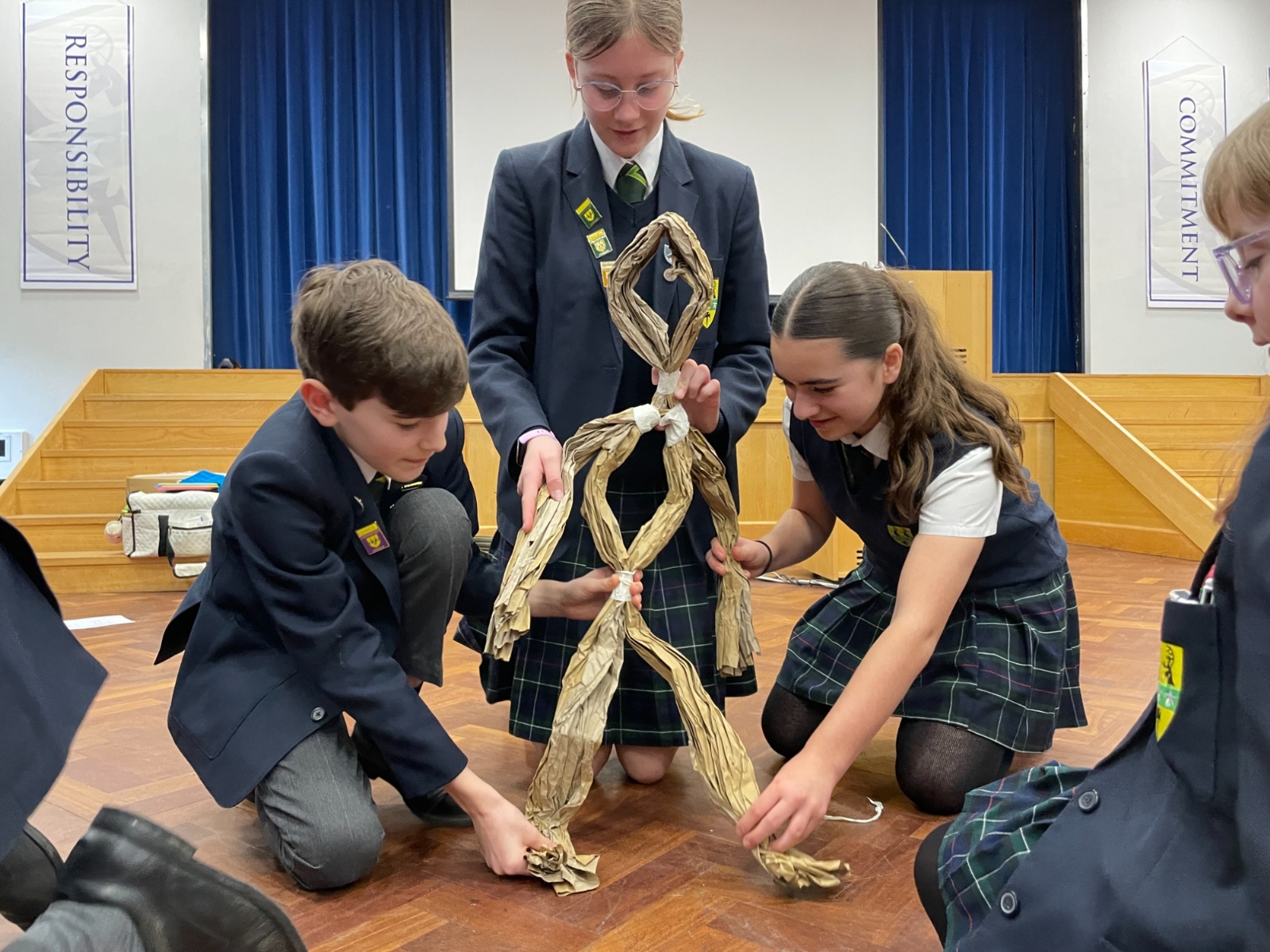 Working in groups, students constructed a puppet frame using only brown parcel paper and tape. By carefully folding the “bone structure,” they were able to create joints that allowed their puppets to move and articulate.