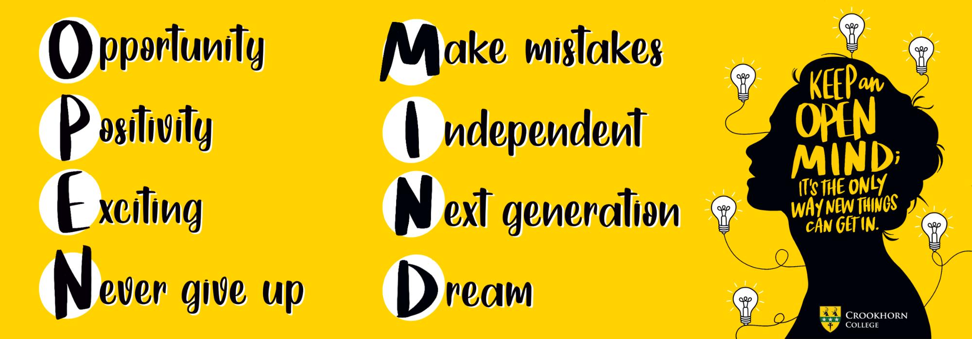Our vision is that the students are inspired by learning, so they continually seek to expand their knowledge and experience outside the classroom. We encourage all our students to develop an OPEN MIND philosophy. We use OPEN MIND as a daily reminder of what learning means at Crookhorn: